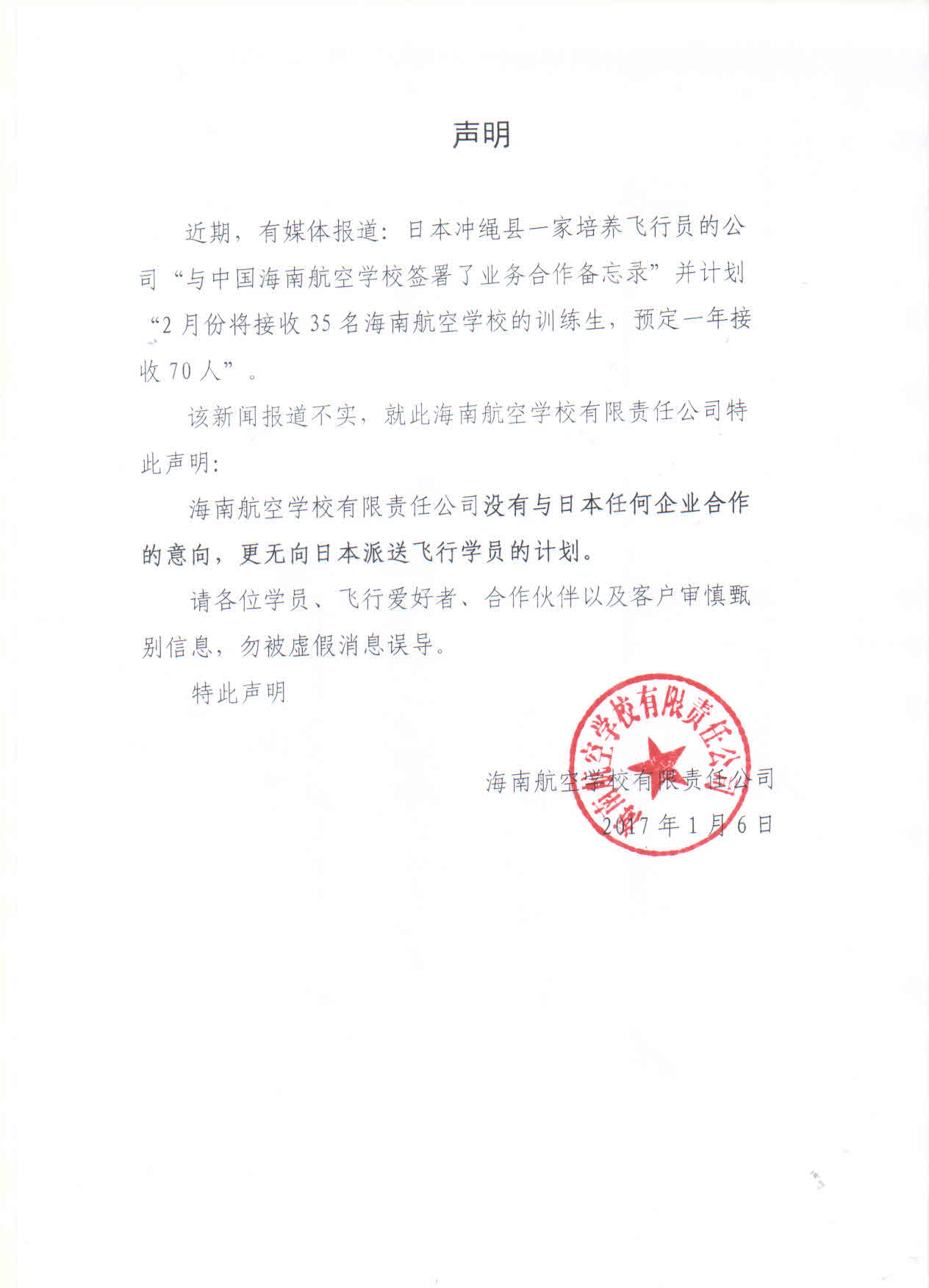該新聞報(bào)道不實(shí),就此海南航空學(xué)校有限責(zé)任公司特此聲明: